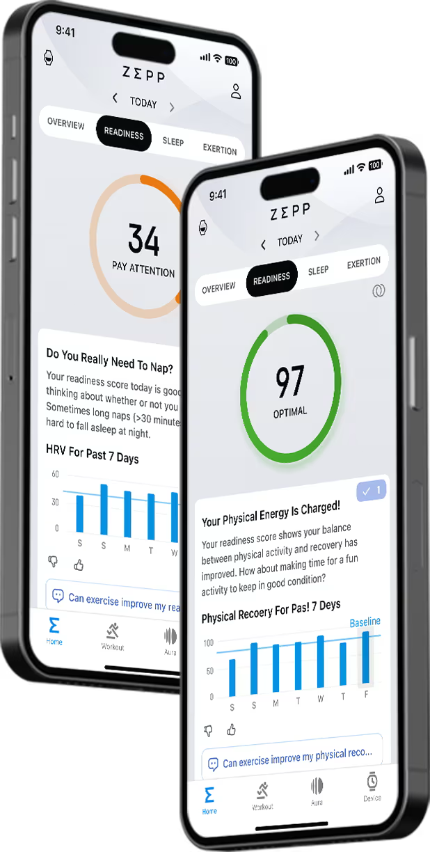 Đeo Amazfit Balance trong khi ngủ và vào buổi sáng, bạn sẽ nhận được điểm Readiness sẵn sàng cho biết bạn đã được nạp năng lượng tinh thần và thể chất như thế nào cho ngày mới.